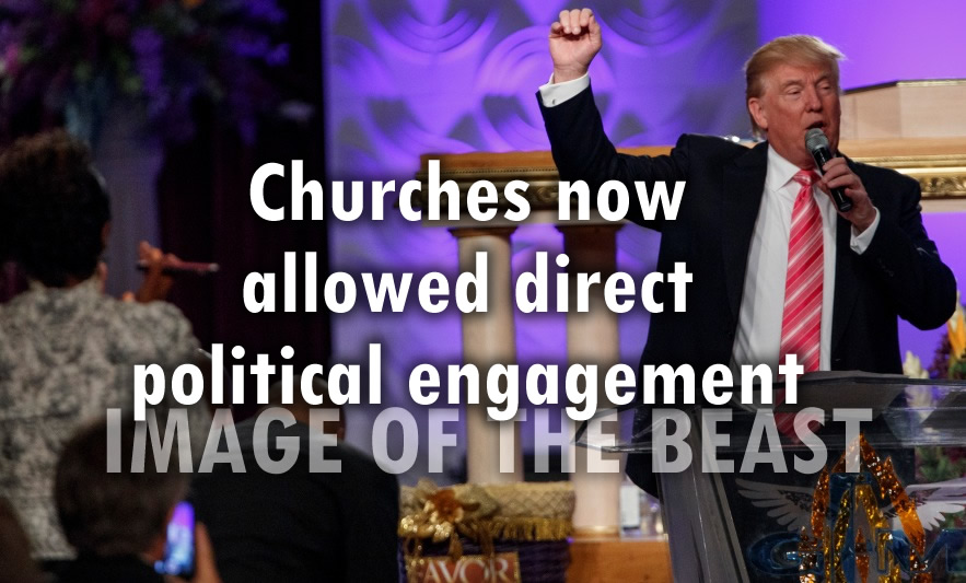 "The church-state image of the beast in America is certainly alive, but as of yet lacks the real power to 'speak and cause' the inhabitants of the world to worship it and bow down to it's dictates. That is changing and we are moving ever closer to the fulfillment of the prophecy in Revelation 13 regarding the 'speaking' of the image of the beast: IRS moves to allow political engagement from churches, in a win for evangelical groups - The IRS on Monday said that religious leaders could endorse political candidates in churches and other religious centers without losing their tax-exempt status, carving out an exemption from a decades-old tax code provision prohibiting nonprofits and churches from direct political engagement." FULL REPORT .