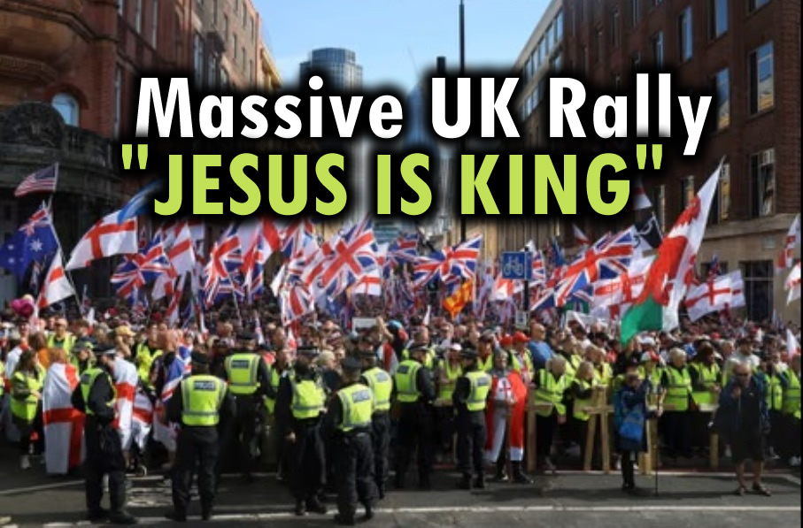 "During a massive protest march in London (UK) a few days ago, in which anywhere between hundreds of thousands to millions of people turned out, it has been reported that many people were chanting and displaying banners that Jesus Christ is king over the nation: 'Jesus is King' chants ring out amid crosses and Christ imagery at huge UK rally - A huge London rally, organized under the theme 'Unite the Kingdom' by former EDL leader Tommy Robinson, concluded with worship songs and prayer from a platform set up in Whitehall ... the demonstration featured displays of wooden crosses held high, images of Christ on flags, and banners declaring 'Jesus is the Way, the Truth, the Life ... It's a Crusade cross. It represents the Crusaders who drove the Muslims and Islamists from Europe, commented a protester from Walsall ... We need to proclaim Christ first, and we need to bring England back as a Christian country ... [a] Pentecostal leader told the crowd, 'This is the moment that we should rise up." FULL REPORT .